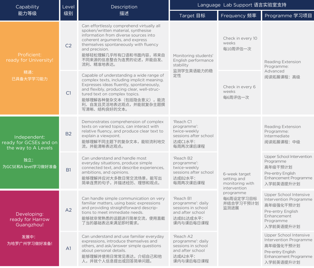 • A1, A2 or B1, they will be invited to join the tailored English Enhancement Programme, at the end of the programme your child will be ready for Harrow Guangzhou.