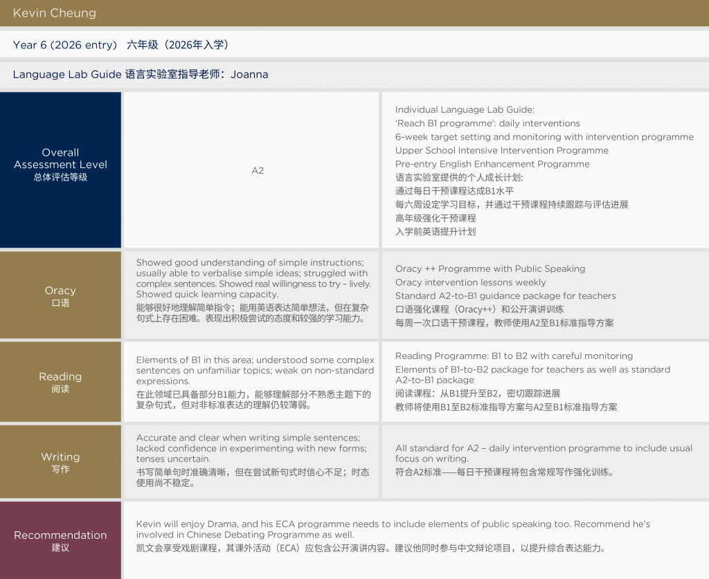 •B2, C1 or C2;see a Language Lab specialist, who will assess their spoken language competency again, and who will make recommendations for Reading Extension Programme texts. Can also talk to the Head of Lower School, the Head of Upper School or to Heads of Subjects to talk about content catch-up if necessary.